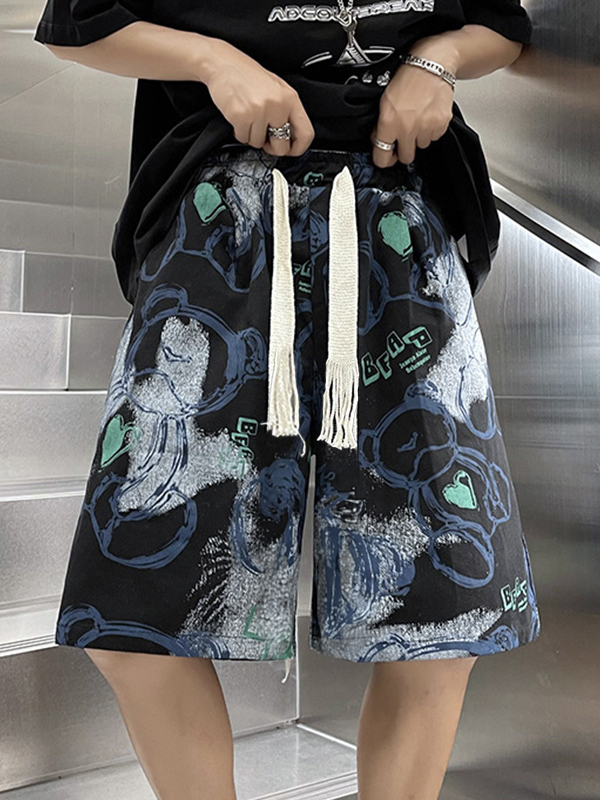 Men’s Irregular Cartoon Bear Print Drawstring Shorts