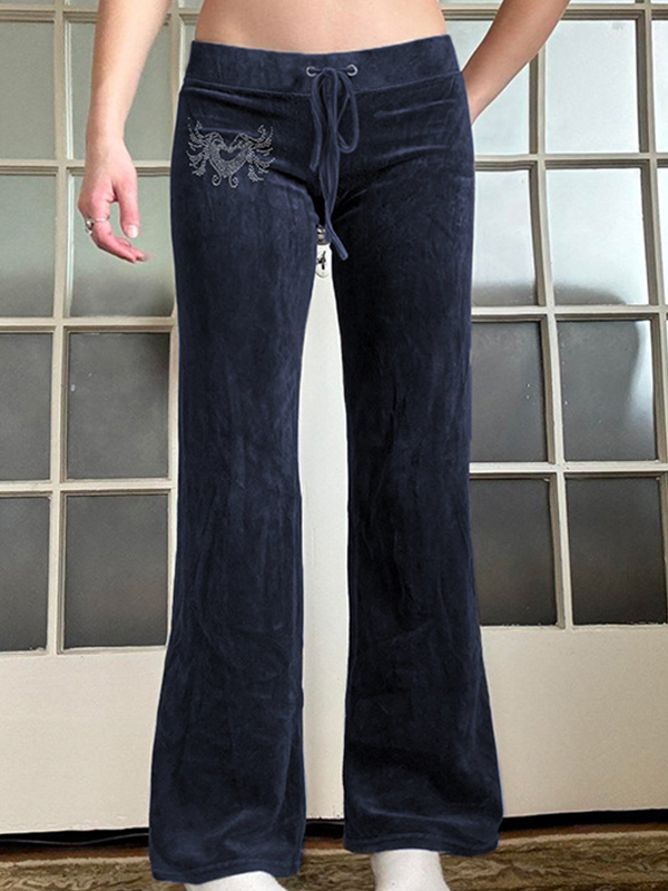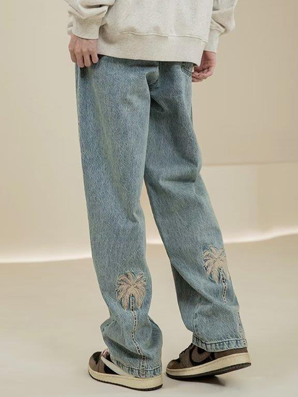 Men’s Coconut Tree Embroidery Print Drawstring Loose Jeans