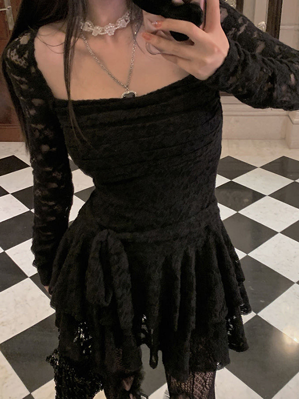 Vintage Square Neck Lace Ruched Tiered Mini Dress