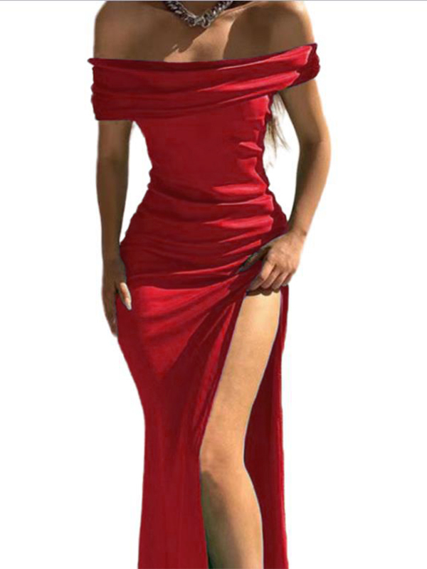 Glossy Solid Off Shoulder Thigh Split Maxi Dress