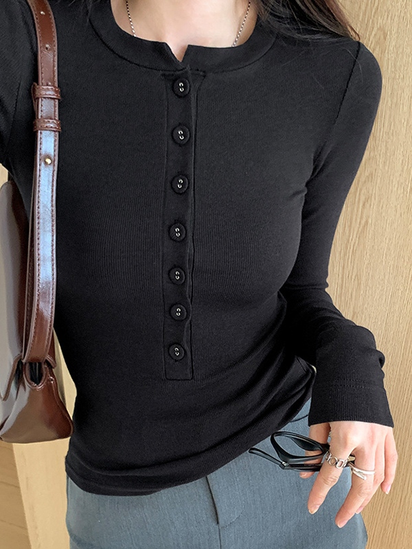 Solid Ribbed Breasted Long Sleeve Tee