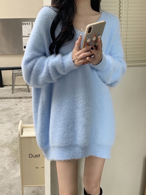 Solid V Neck Fuzzy Loose Sweater